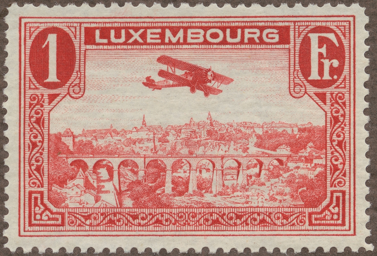 Frimärke från Luxemburg, 1931. Motiv av Biplan över staden Luxemburg Luxemburgs första flygmärke