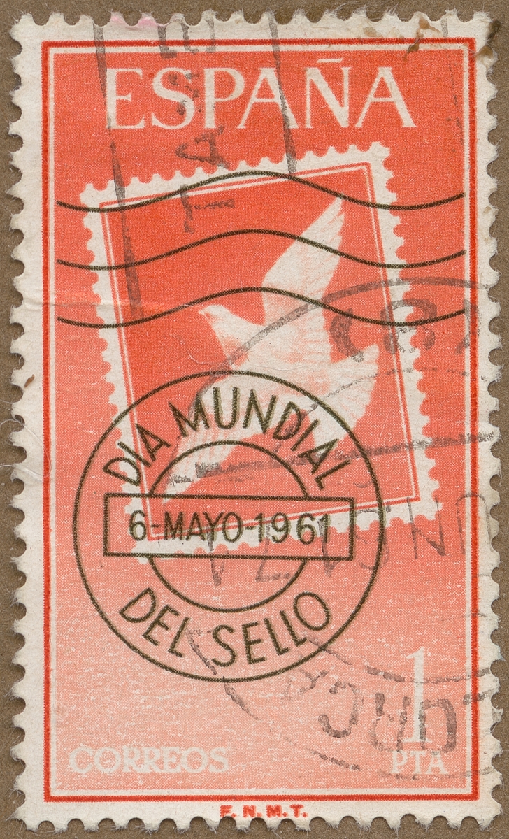 Frimärke från Spanien, 1961. Motiv av Brevduva: symbol för flygpost "Internationell Frimärke Dag: Den 6 maj 1961."