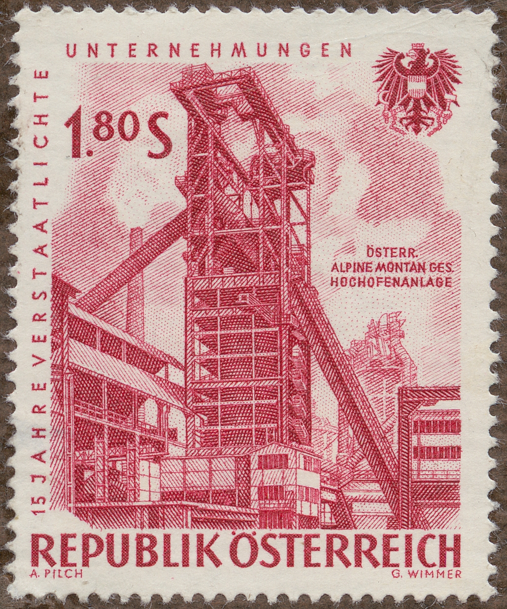 Frimärke från Österrike, 1961. Motiv av Masugnsanläggning Alpine Montan Gesellschaft -Österrike- -Minne av 15 år i statlig regi-