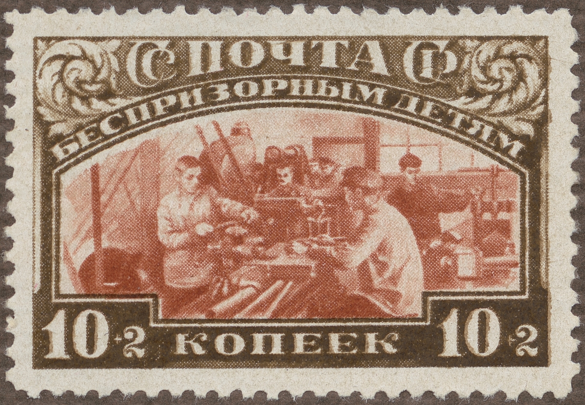 Frimärke från Ryssland, 1928. Motiv av Pojkar i verkstadsarbete "Serie för barnhjälp"