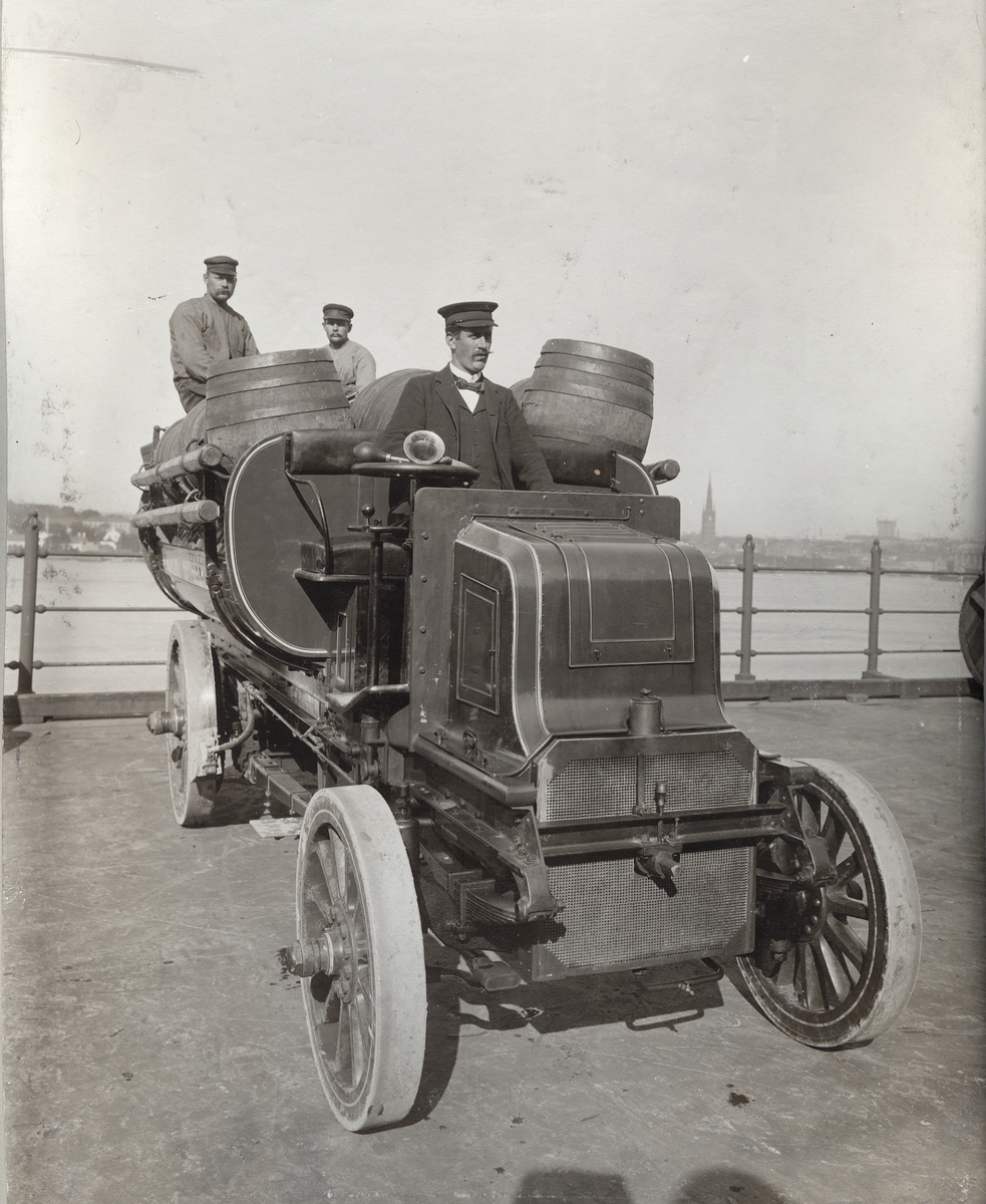 10 hk, 2 cyl. Daimler lastvagn för 5000 kg belastning. Levererad till Münchens Bryggei, Stockholm 1903.