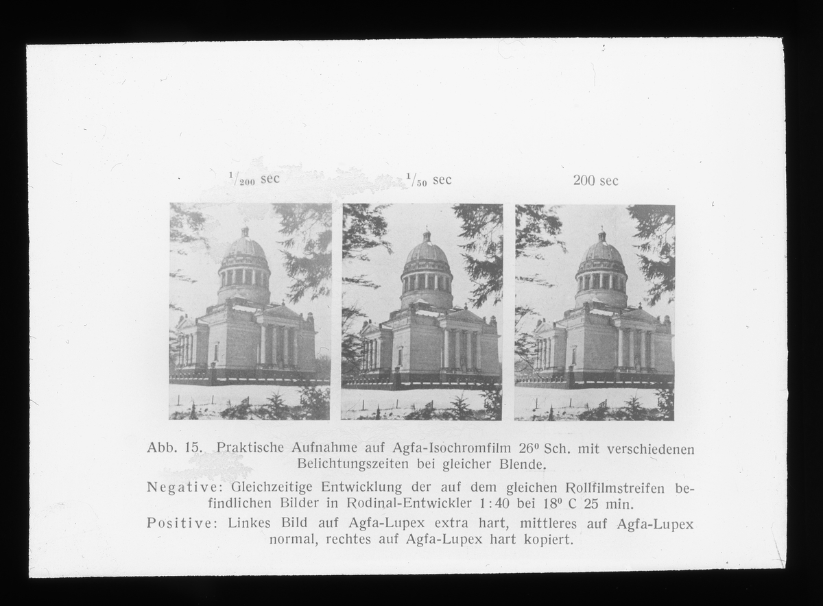 Skioptikonbild från Institutionen för fotografi vid Kungliga Tekniska Högskolan. Använd av professor Helmer Bäckström som föreläsningsmaterial. Bäckström var Sveriges första professor i fotografi vid Kungliga Tekniska Högskolan i Stockholm 1948-1958.