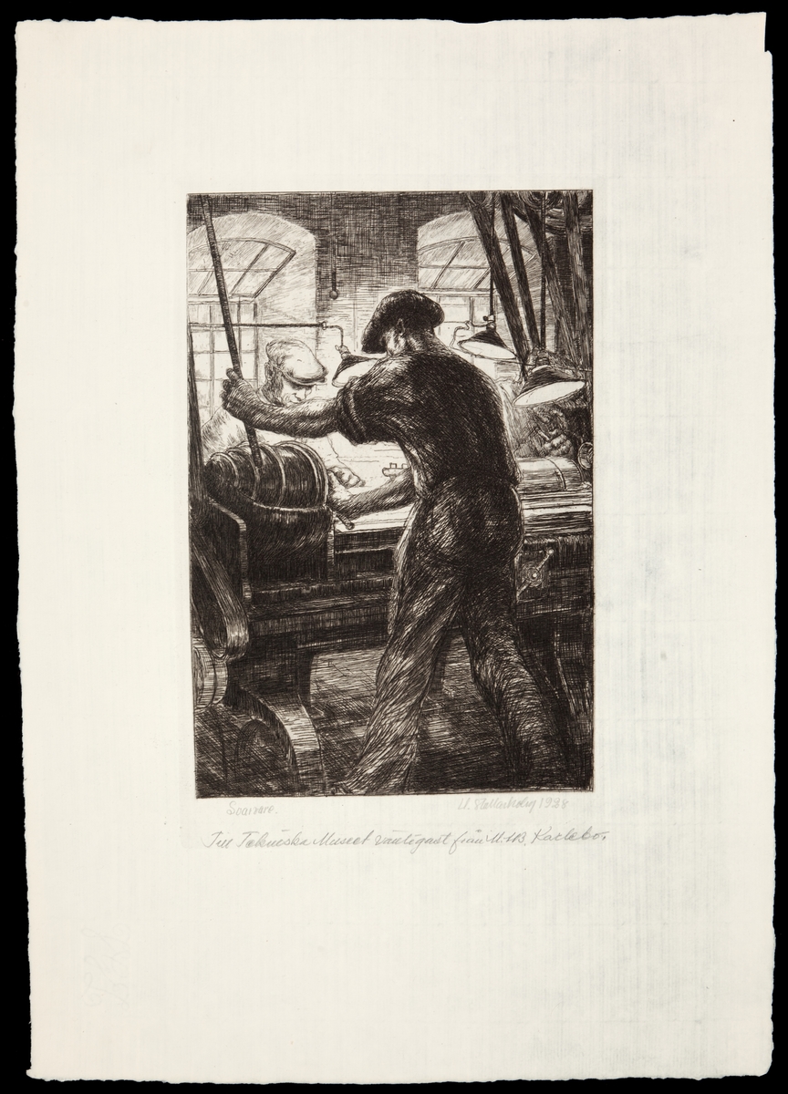 Etsning med motiv av svarvare vid AB Separator i Stockholm.Tillverkad av Uno Stallarholm, 1928.