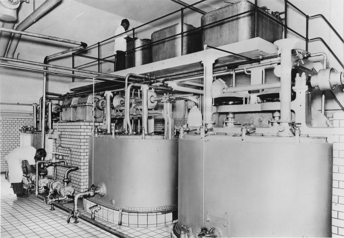 Margarinbolaget AB i Stockholm. Fettempereringspannor och därunder kärnor, i vilka fett och mjölk samt överiga ingredienser blandas och emulgeras.