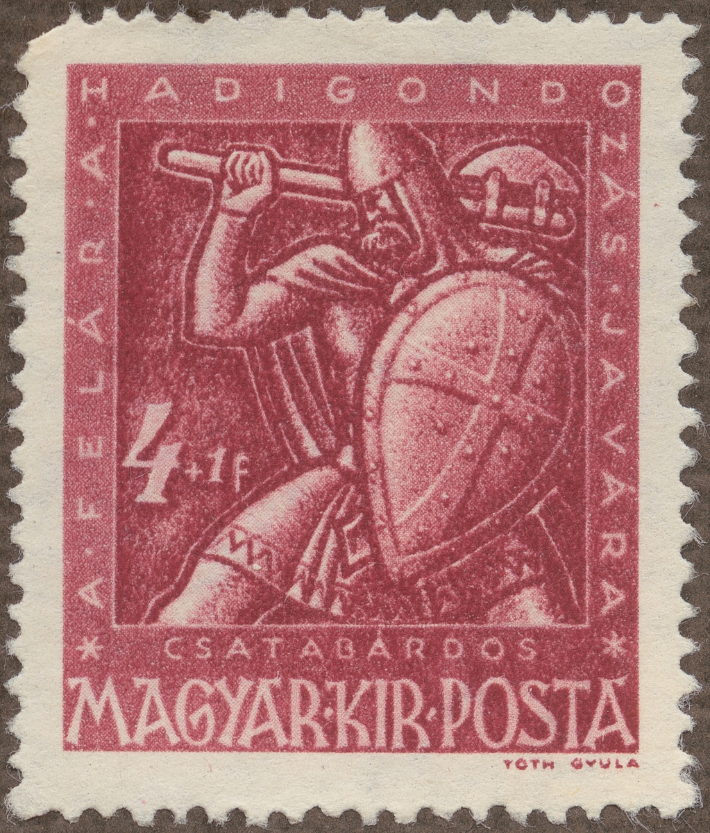 Frimärke från Ungern, 1943. Motiv av Ungerska vapen i gamla tider: Stridsyxa Sköld "Serie: Till förmån för krigsinvalider"