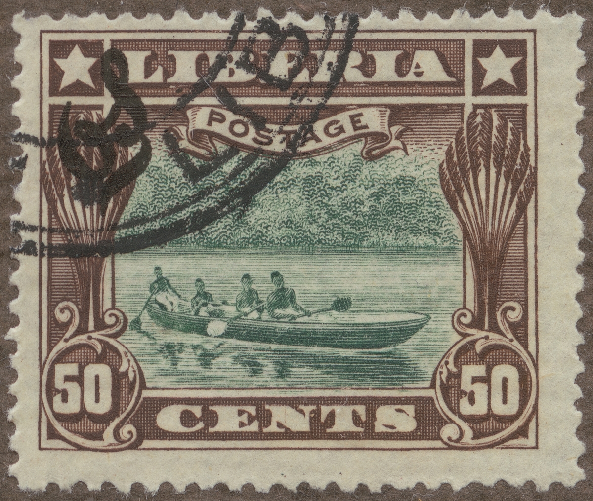 Frimärke från Afrika: Liberia, 1909. Motiv av "Pirog" med lokalbor Framdrives genom paddling