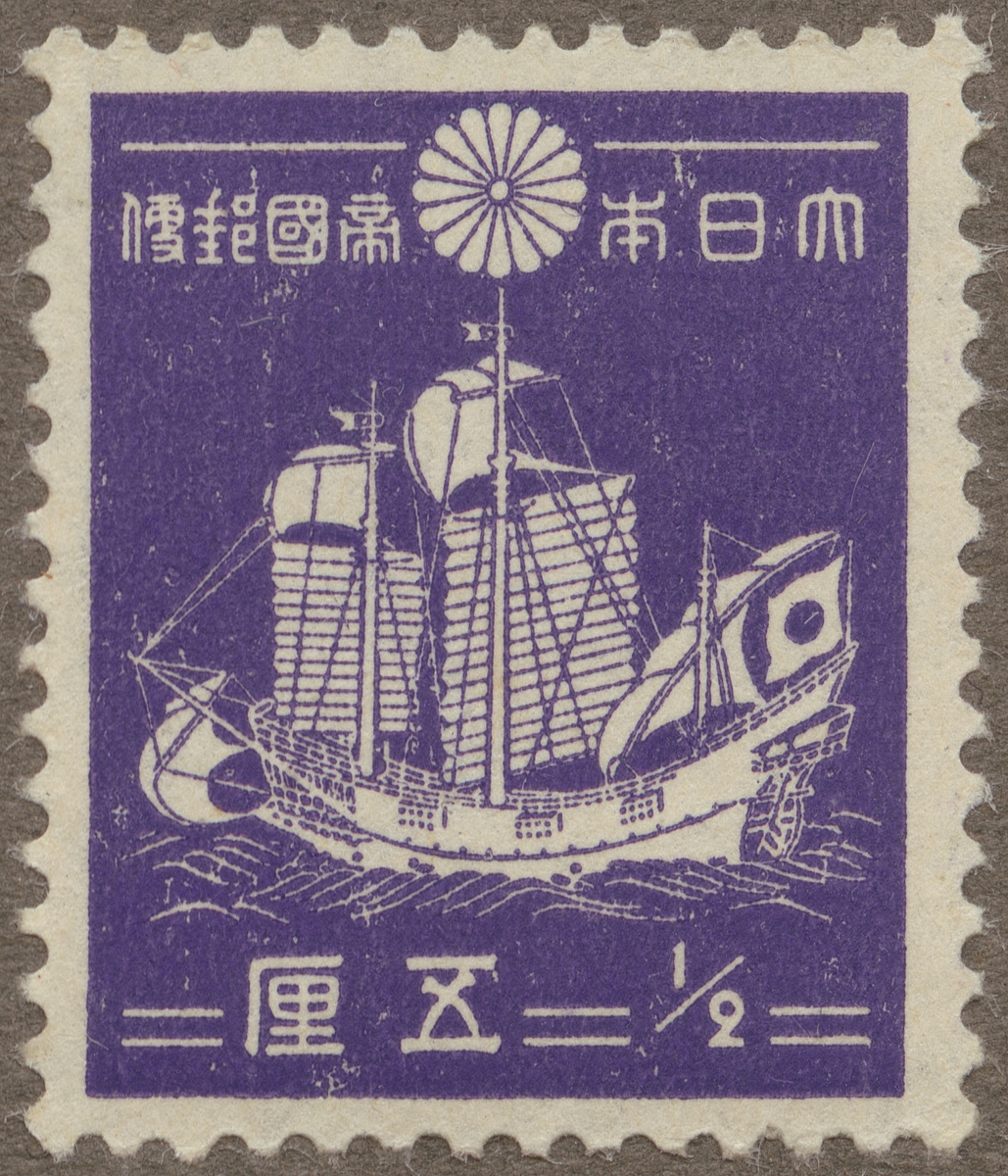 Frimärke från Japan, 1937. Motiv av Japanskt gammaldags handelsfartyg: s.k. "Goshuninbune". Seglen bestå av mattor uppspända på rår av bambusrör. Motsvarande kinesisk "djonk" eller "junk". I allmänhet mycket välseglande.
