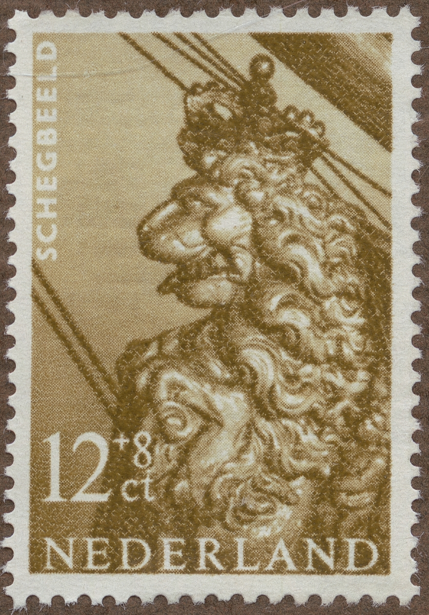 Frimärke från Nederländerna, 1962. Motiv av Träskulptur: Heraldiskt lejon som galjonsfigur på Amiralitets tremastare från 1698. :Från Riksmuseet, Amsterdam "-Museum serie-"