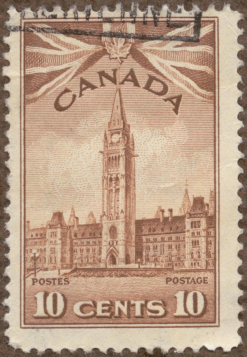 Frimärke från Kanada, 1943. Motiv av (ovan) Kanadas flagga (nedan) Parlamentshuset i Ottawa. -Propaganda för Kanadas insats i världskrig II-