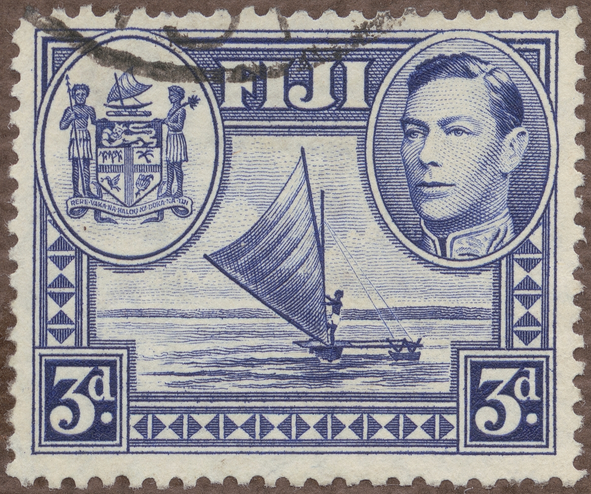 Frimärke från Fiji-öarna, 1938. Motiv av Segelkanot med utliggare (t.h.): Kung George VI-
