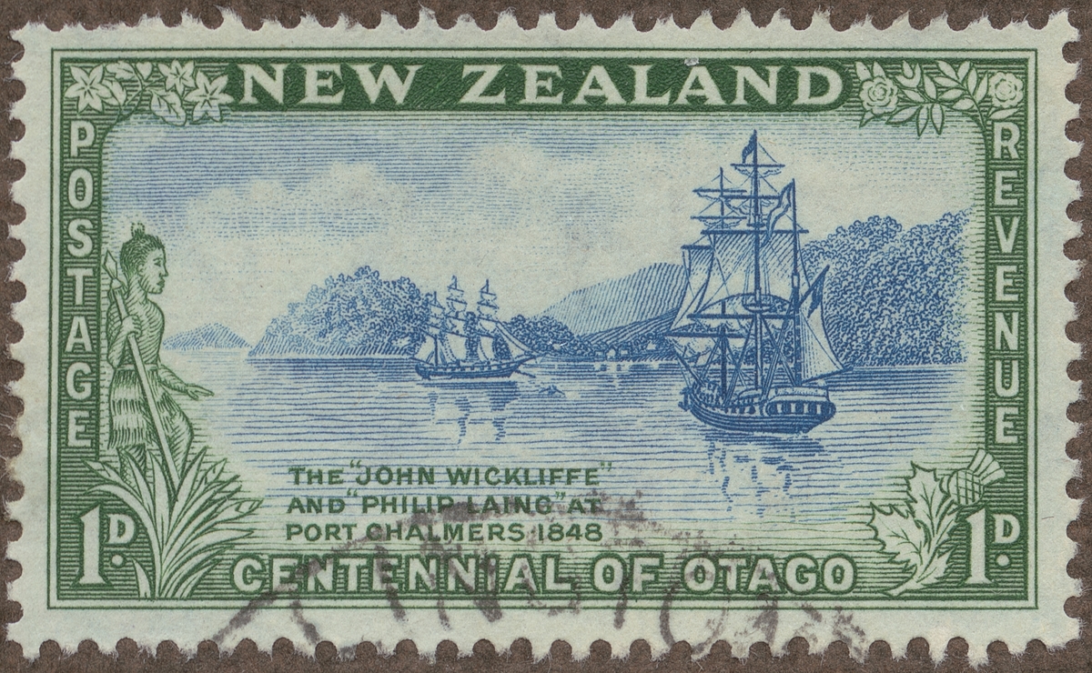 Frimärke från New Zealand, 1948. Motiv av Segelfartygen "John Wickliffe" och "Philip Laing" i Chalmers hamn på New Zealand: 1848. -100-årsminne: 1848-1948.