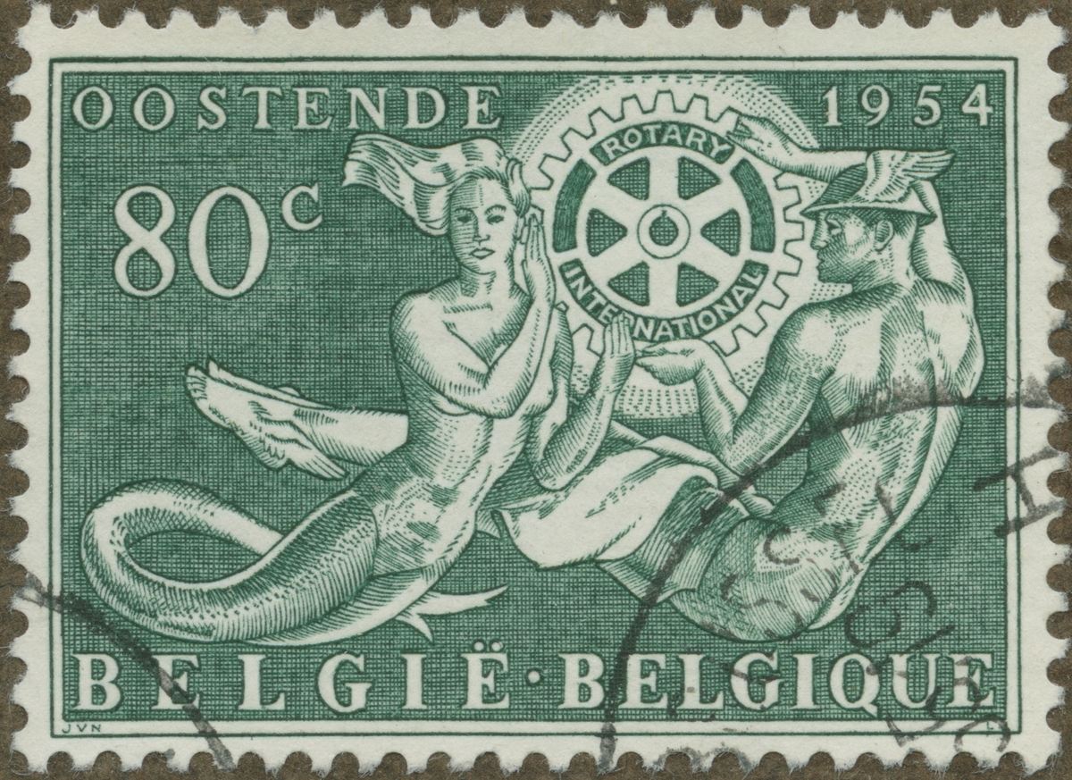 Frimärke ur Gösta Bodmans filatelistiska motivsamling, påbörjad 1950. Frimärke från Belgien, 1954. Motiv av kugghjul som symbol för samarbete. "Rotary Klubben i Chicago 50 år. 1904-1954."