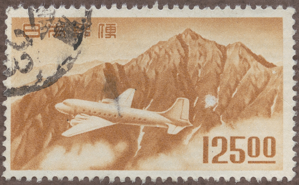 Frimärke från Japan, 1952. Motiv av Fyrmotorigt monoplan över Tsurugi-dake berget.