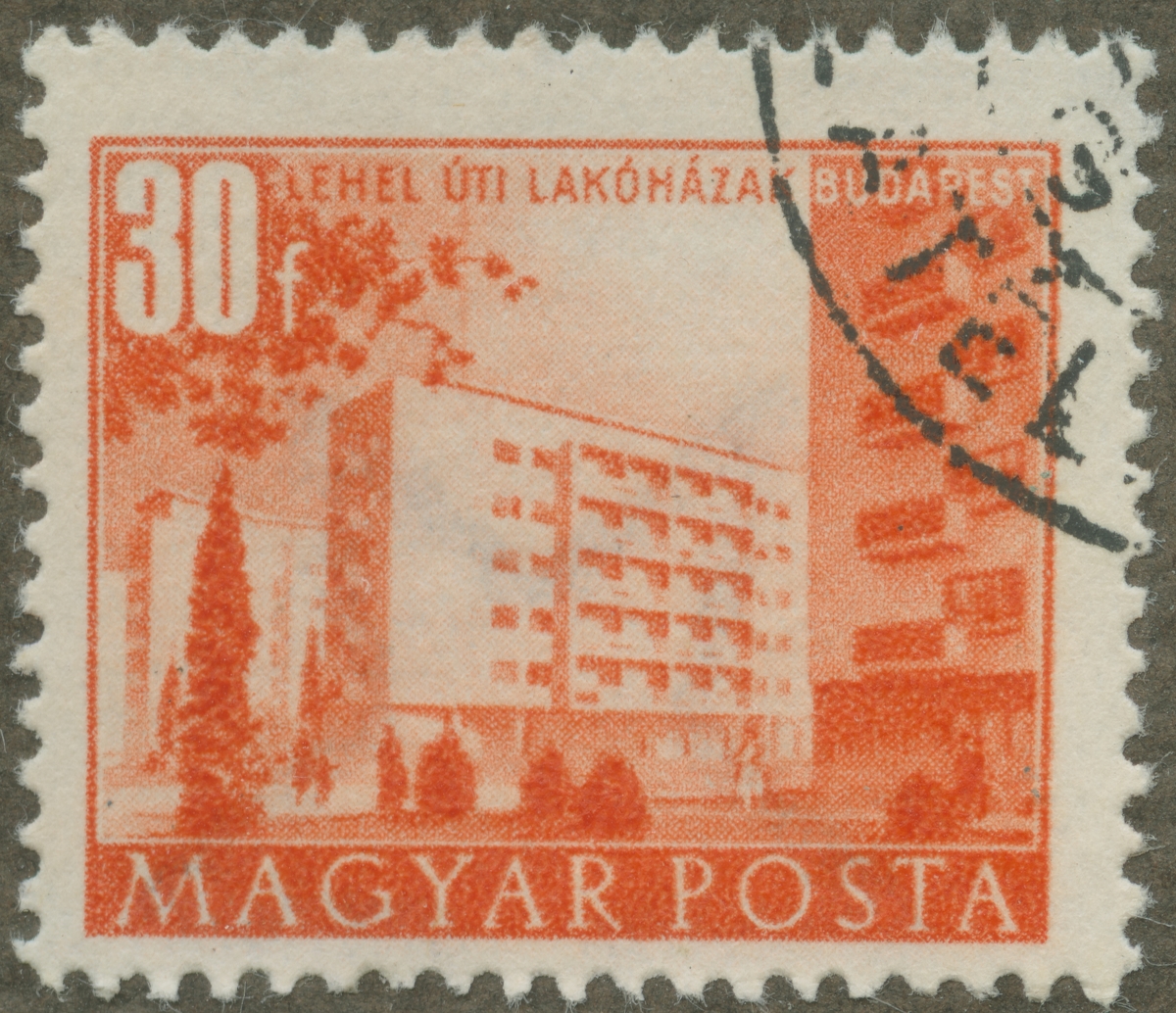 Frimärke från Ungern, 1951. Motiv av moderna lägenheter i Budapest. "Återuppbyggnadsserie".