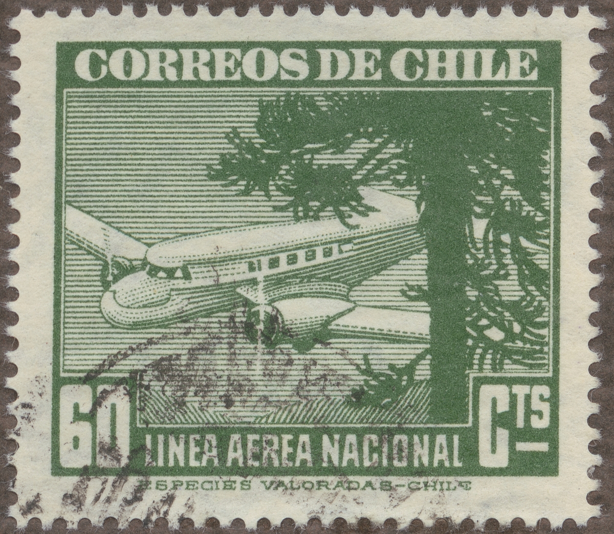 Frimärke från Chile, 1941. Motiv av Tvåmotorigt Passagerarplan Monoplan