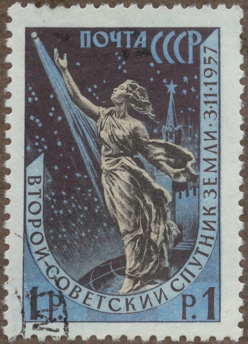 Frimärke från Ryssland, 1958. Motiv av Den andra ryska satellit: "Sputnik II" 3 november 1957.