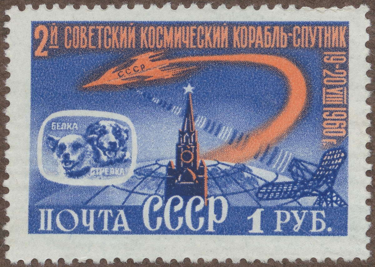 Frimärke från Ryssland, 1960. Motiv av Sovjetrymdskeppet Sputnik II 19-20 augusti 1960 med rymdhundarna Bjelka och Strelka som passagerare.