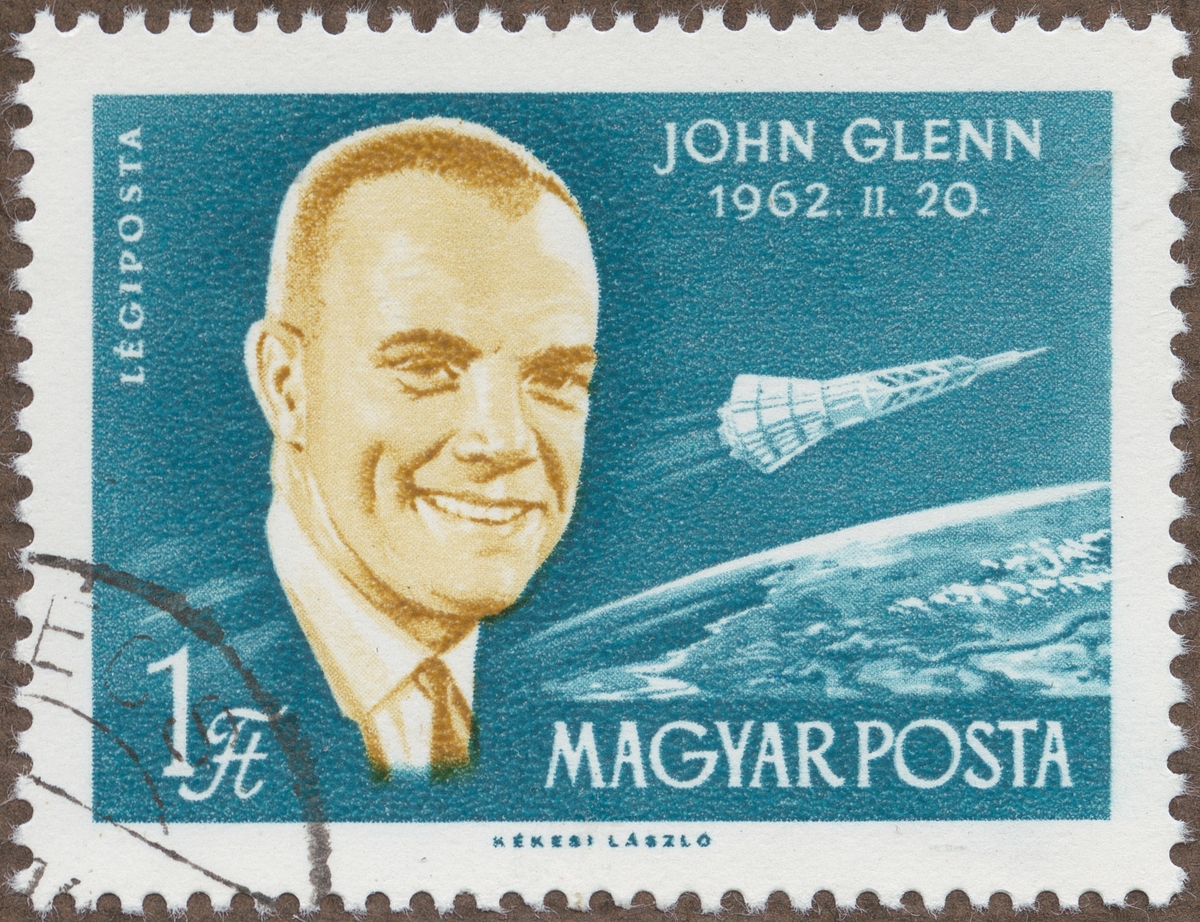 Frimärke från Ungern, 1962. Motiv av Den förste amerikanska kosmonaut: John Glenn: Minne av hans rymdfärd runt jorden i rymdkapseln "Friendship VII" Januari 20, 1962. "-Astronaut Serie-"