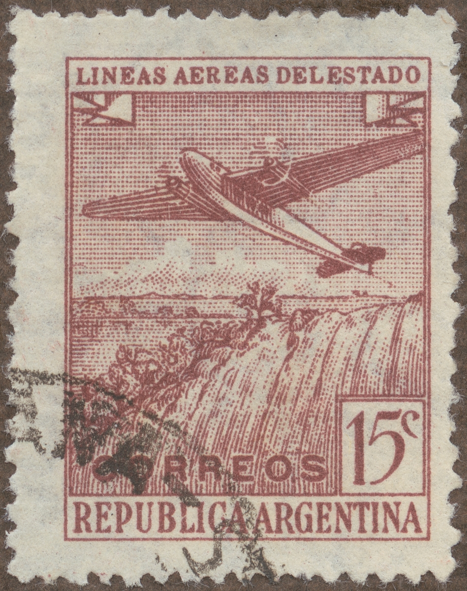 Frimärke från Argentina, 1946. Motiv av Tvåmotorigt monoplan över vattenfallet Iguassú- "Flygpropaganda."