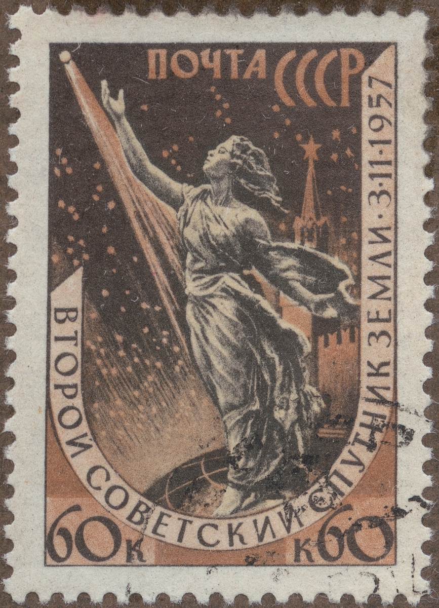 Frimärke från Ryssland, 1958. Motiv av Den andra ryska satellit: "Sputnik II" 3 november 1957.