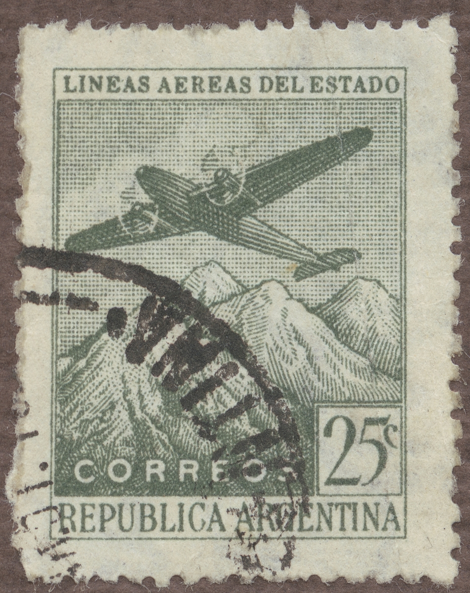 Frimärke från Argentina, 1946. Motiv av Tvåmotorigt monoplan över Anderna.