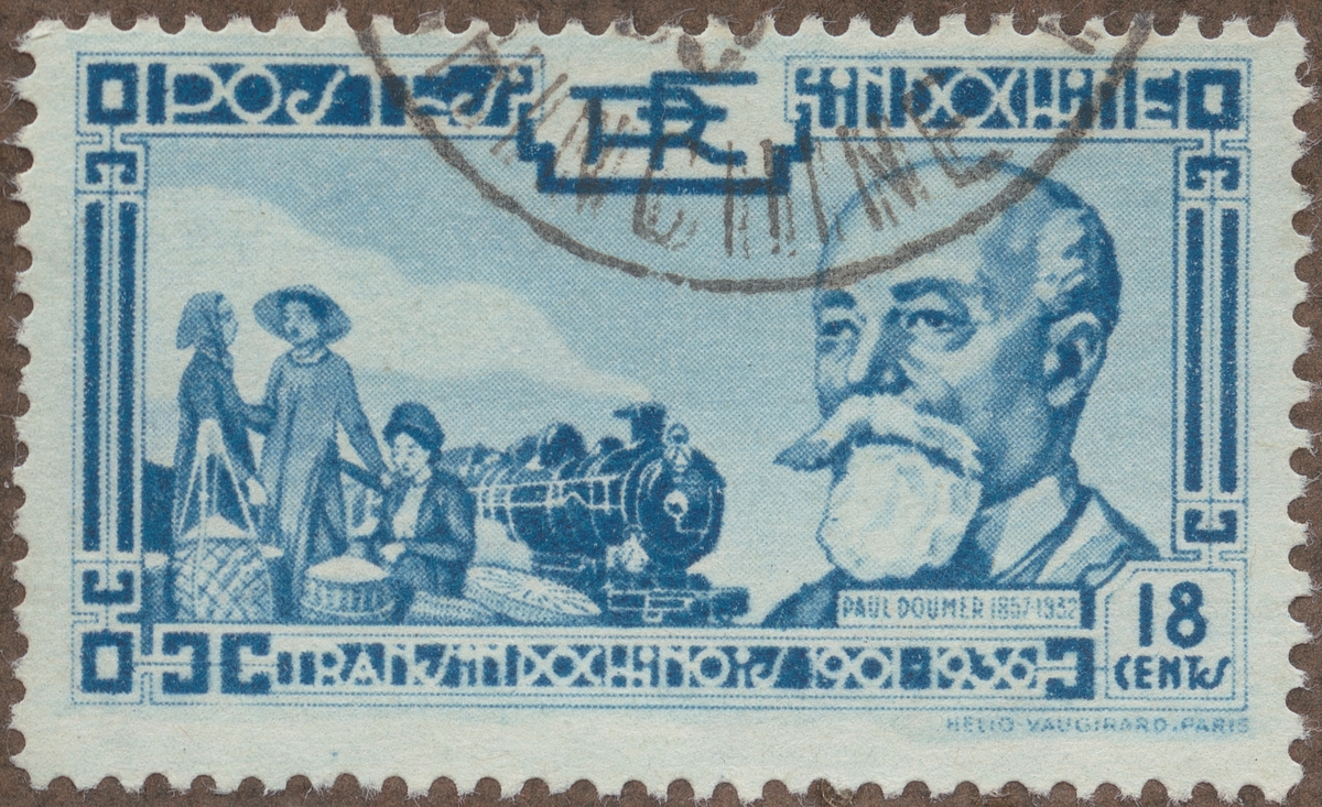 Frimärken ur Gösta Bodmans filatelistiska motivsamling, påbörjad 1950. Frimärke från Indokina, 1938. Motiv av Järnvägståg i Indokina. Pres. Paul Doumer ": 1857-1932. Guvenör-gen. Indokina: 1897-1902. President: Frankrike 1931-32." "- Den trans-indokinesiska banan 35 år: 1901-1936-"