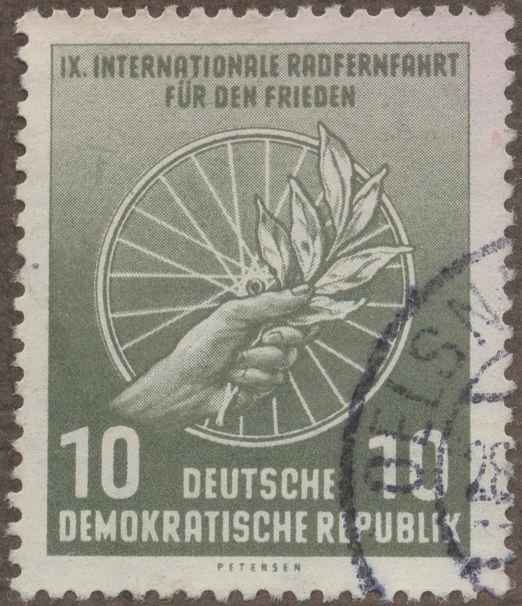 Frimärken ur Gösta Bodmans filatelistiska motivsamling, påbörjad 1950. Frimärke från Öst-Tyskland, 1955. Motiv av Cykelhjul "9-de cykeltävlingen för freden. - Propaganda för Prag-Berlin-Warshawa cykeltävlingen: 1955 - "