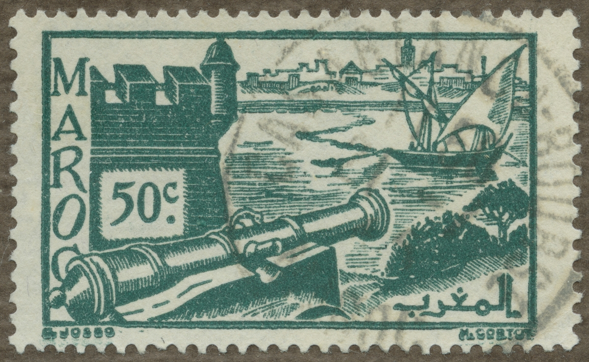 Frimärke från Fr. Marocko, 1939. Motiv av Hamnen i Saiè