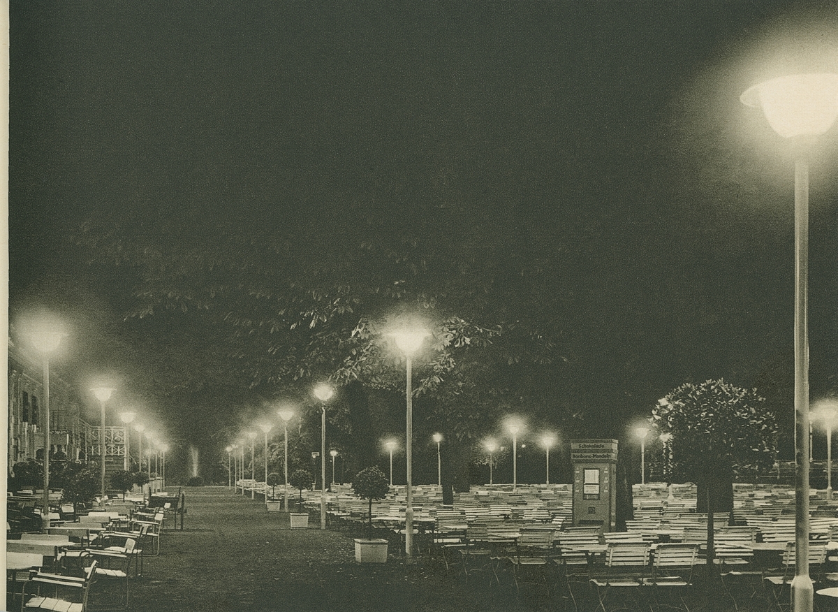 "Gartenrestaurant", "Tonhallen-Garten, Düsseldorf, Gartenleuchten AG 16 zu 300 watt".