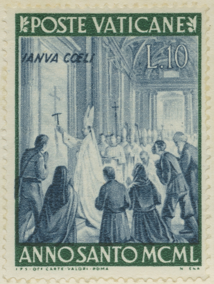 Frimärke från Vatikanen, 1950. Motiv av Påven, Pius XII som öppnar porten till St. Petersdomen. "Det heliga året 1950".