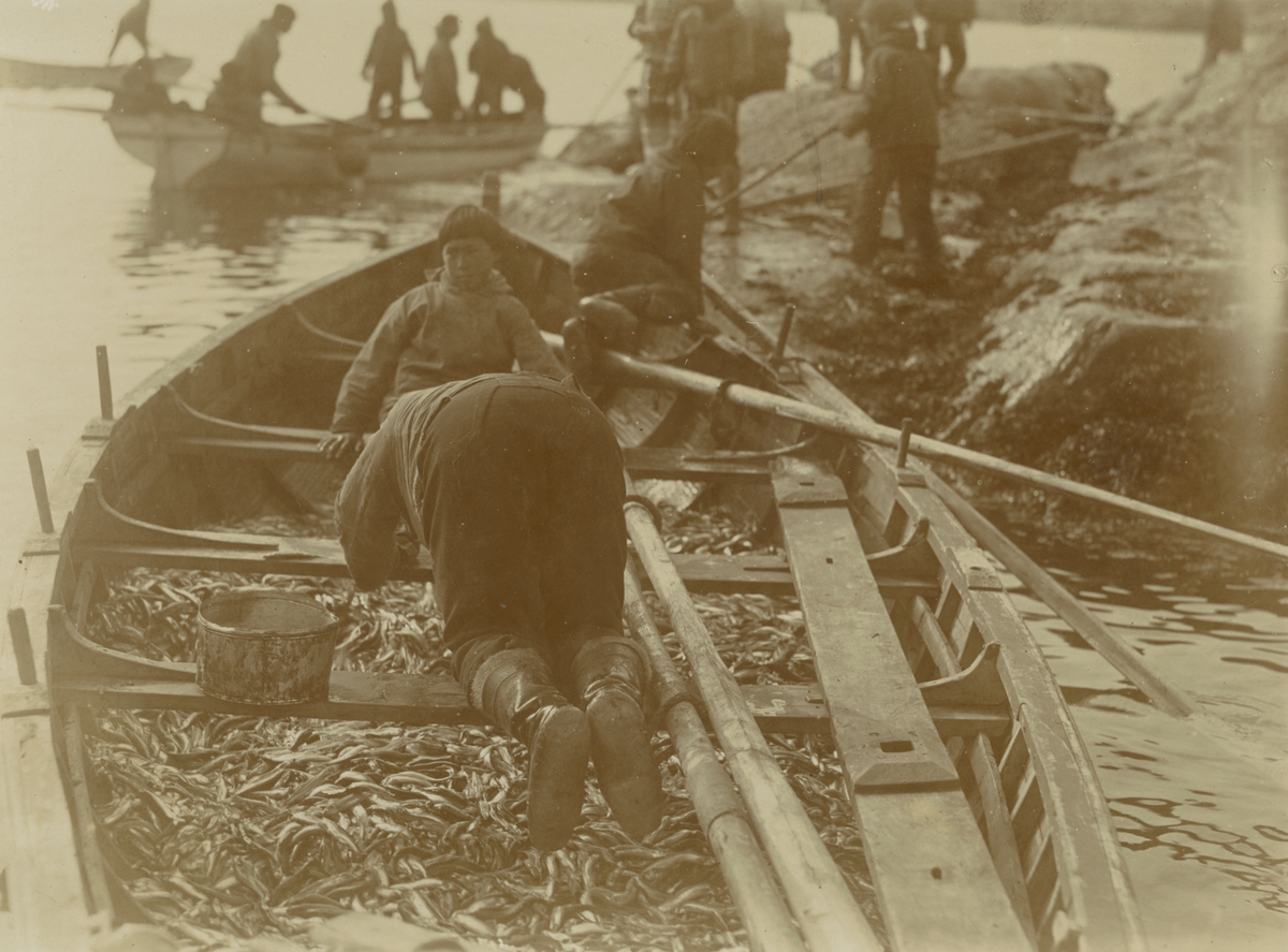 Fotografi från expedition till Grönland. Motiv av fiskare som återvänt efter en dags arbete i en träbåt full av fisk.