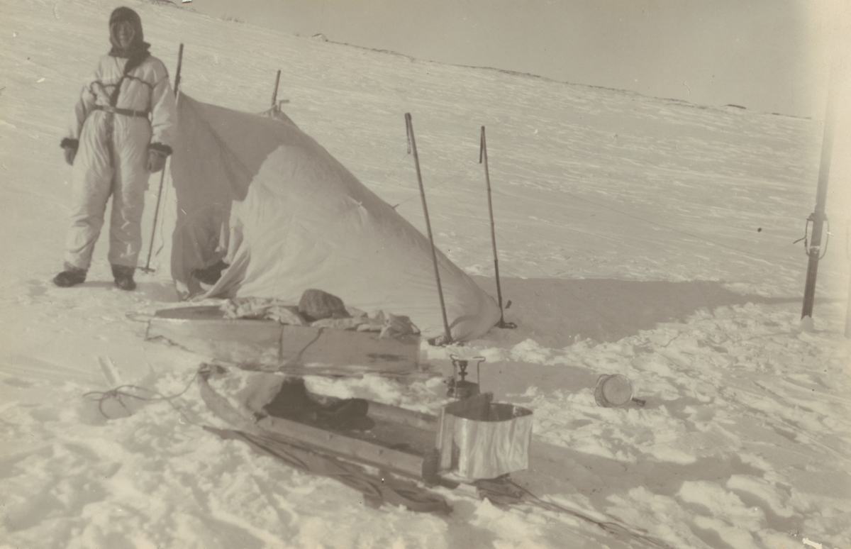Diverse bilder ur Fred Goldbergs samling. Motiv av man med tält och packning i ett snölandskap.