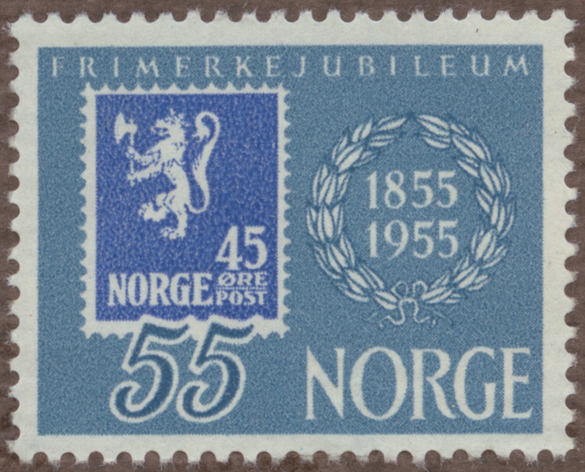Frimärke från Norge, 1955. Motiv av Reproduktion av norskt frimärke från 1922 "Norges frimärken 100 år 1855-1955."