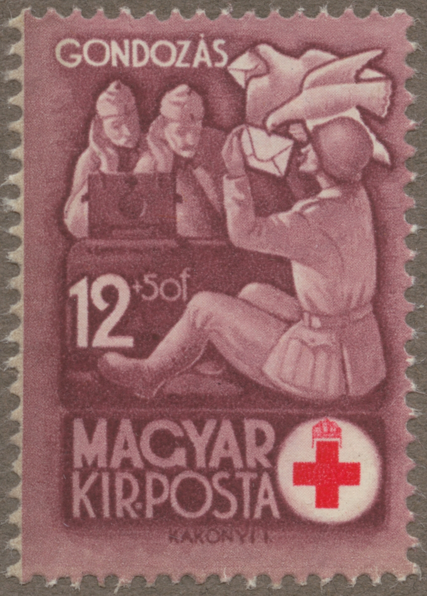 Frimärke från Ungern, 1942. Motiv av Nyhetsförmedling. I bakgrunden: med brevduvor, i bakgrunden: med radio, Ungern 1942.