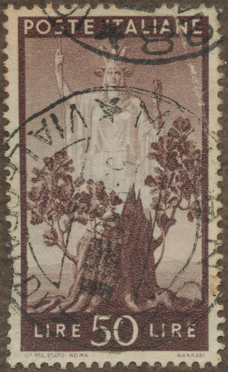 Frimärke från Italien, 1945. Motiv av Italia- symbol Gammal ekstubbe med friskt skott