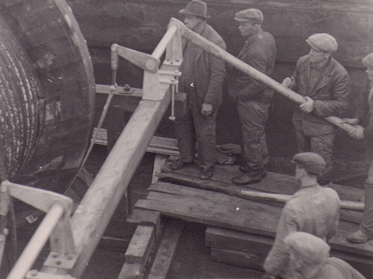 Sjökabel. Görveln. Lagerbockar med handbromsar, ritning 491100 voro nykonstruerade och begagnades för första gången vid denna utläggning. 1949.