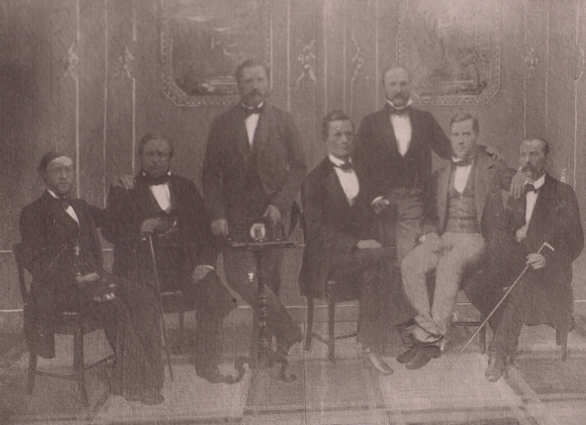 Tjänstemännen vid Norrköpings station år 1860. Börjesson, Hellman, Meuller, Björkman, Starbäck, Soodenstjerna, Berg.