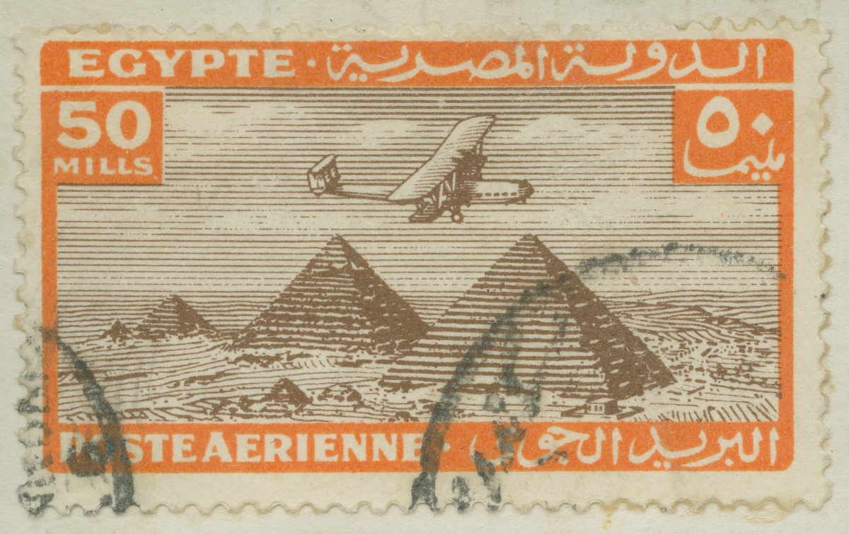 Frimärke från Egypten, 1933. Motiv av monoplan över pyramiderna vid Ginzeh.