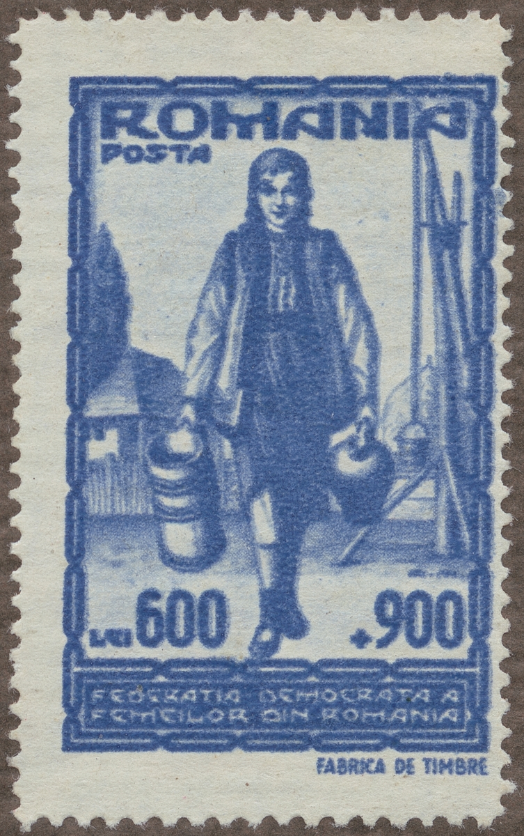 Frimärke från Rumänien, 1947. Motiv av kvinna med stäva och vattenkruka. "Propaganda för kvinnligt arbete"
