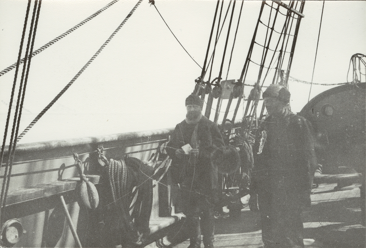 Fotografi från första svenska Antarktisexpeditionen 1901-1904. Motiv av två expeditionsdeltagare ombord på fartyget Uruguay.