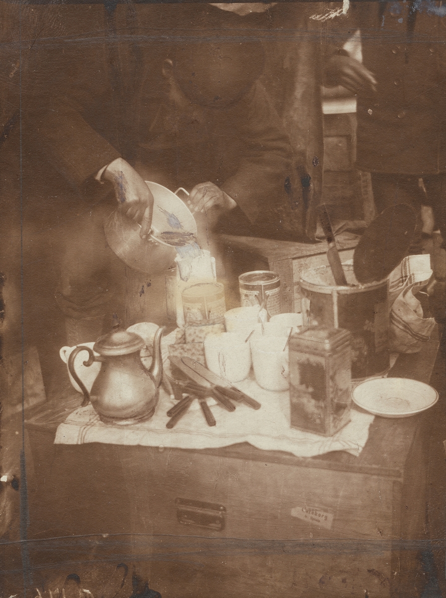 Fotografi från första svenska Antarktisexpeditionen 1901-1904. Motiv av Otto Nordensköld som tillreder kaffe genom att hälla varmt vatten ur en kastrull.