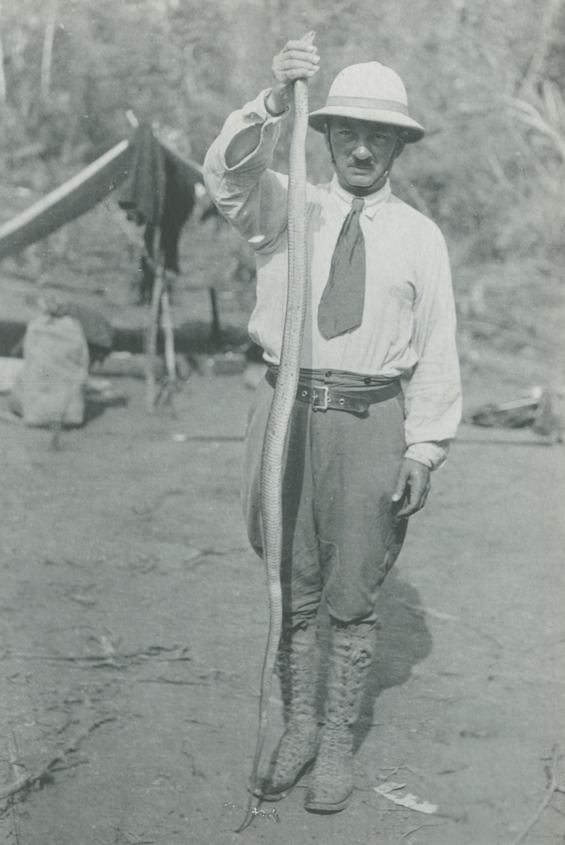 Fotografi från expedition till Peru 1920. Motiv av man i tropikhjälm och slips som håller upp en orm.