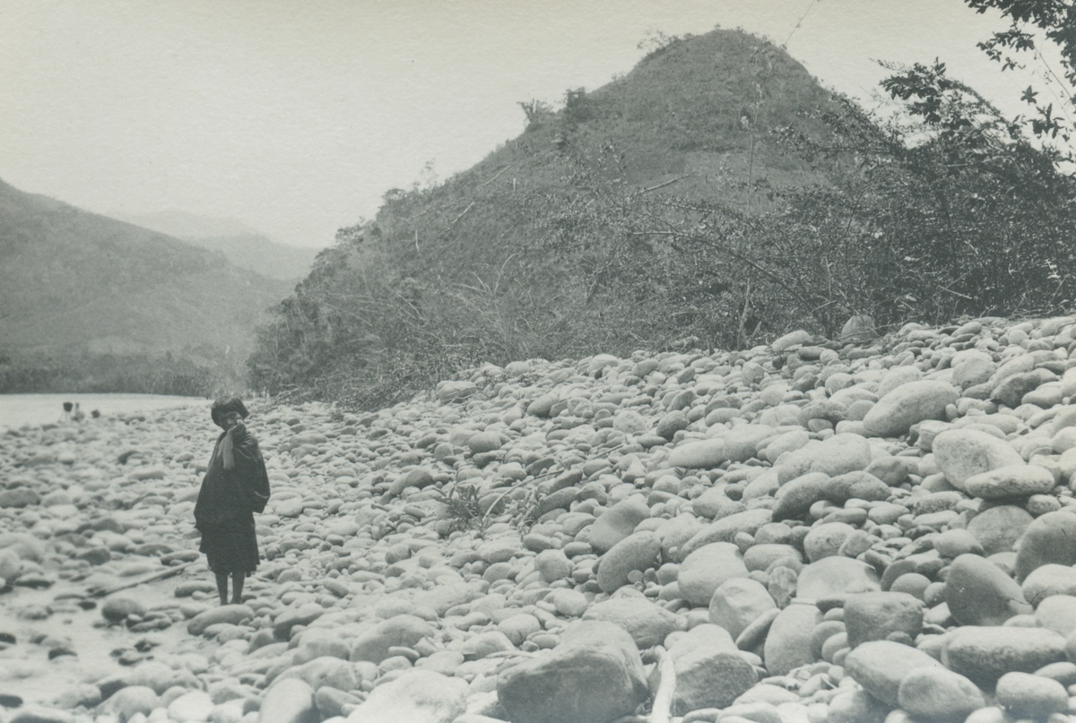 Fotografi från expedition till Peru 1920. Motiv av barn på stenig strand nedanför berg i djungeln.