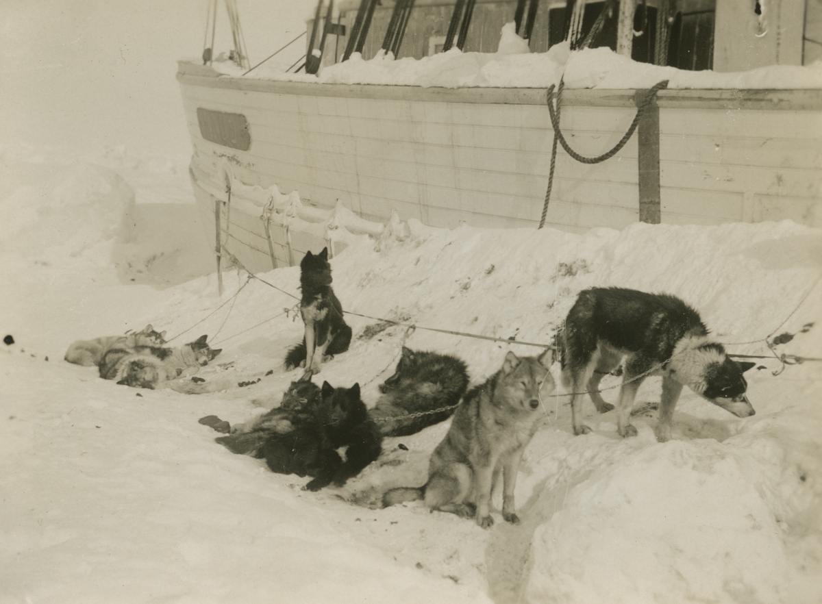 Fotografi från Maudexpeditionen. Motiv av hundspann i snön bredvid båt.