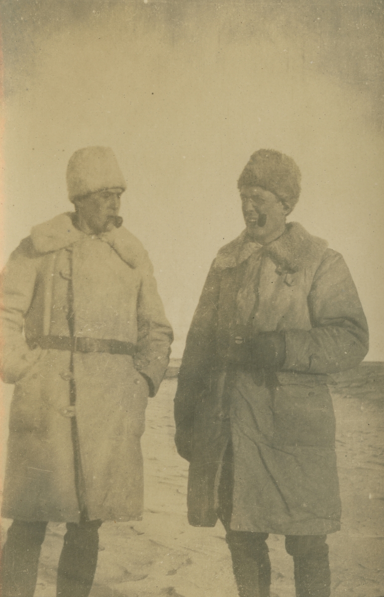 Fotografi från expedition till Spetsbergen. Motiv av två vinterklädda män som röker pipa.