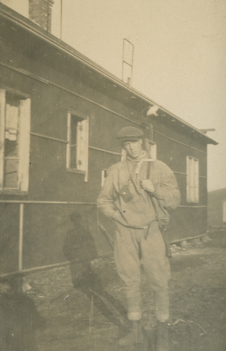 Fotografi från expedition till Spetsbergen. Motiv av man med keps på huvudet och gevär runt axeln stående utanför ett trähus.