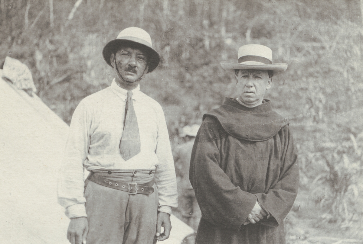 Fotografi från kuvert märkt med "Ernst Nordenskjöld". Motiv av två expeditionsdeltagare. En av dem bär en tropikhjälm, en är iklädd en munkkåpa.