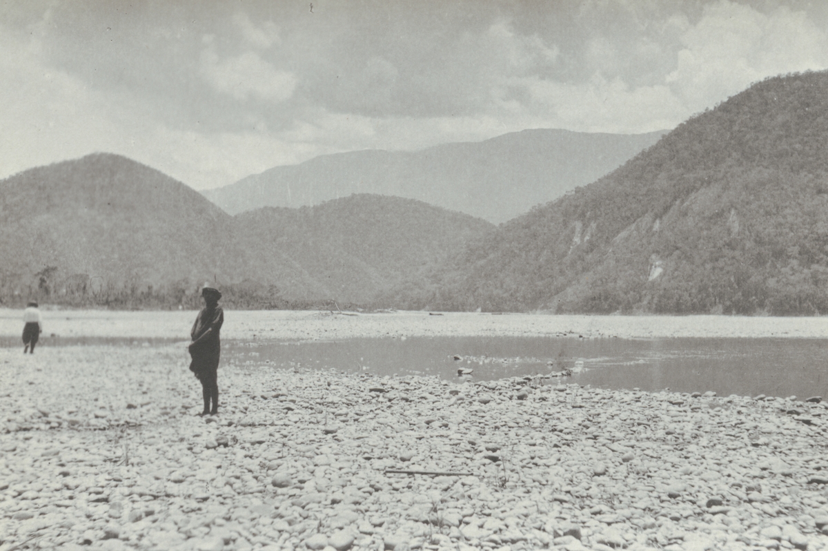 Fotografi från kuvert märkt med "Ernst Nordenskjöld". Motiv av man som står i ett stenlandskap nedanför berg.