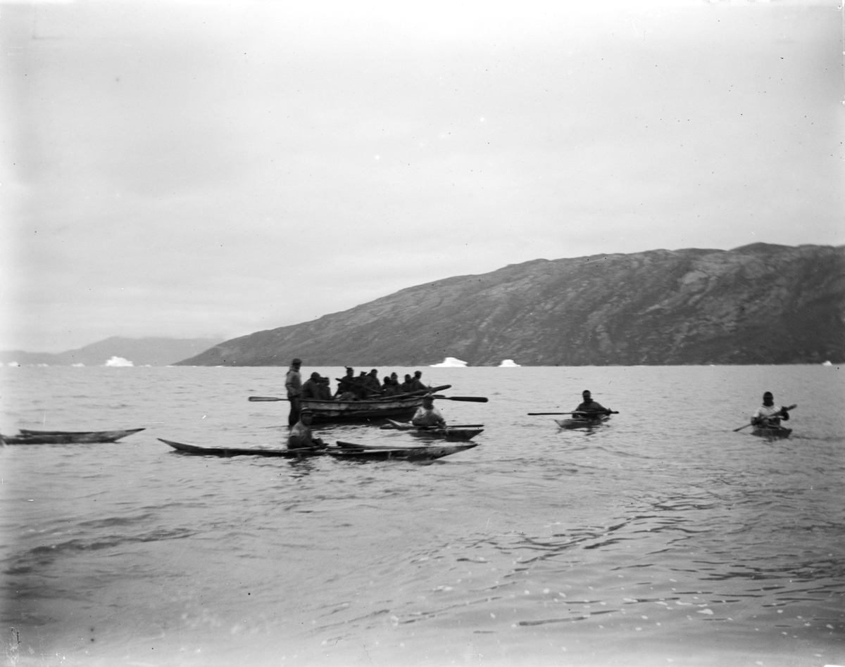 Fotografi från Grönland. Motiv av ett antal personer i båtar.