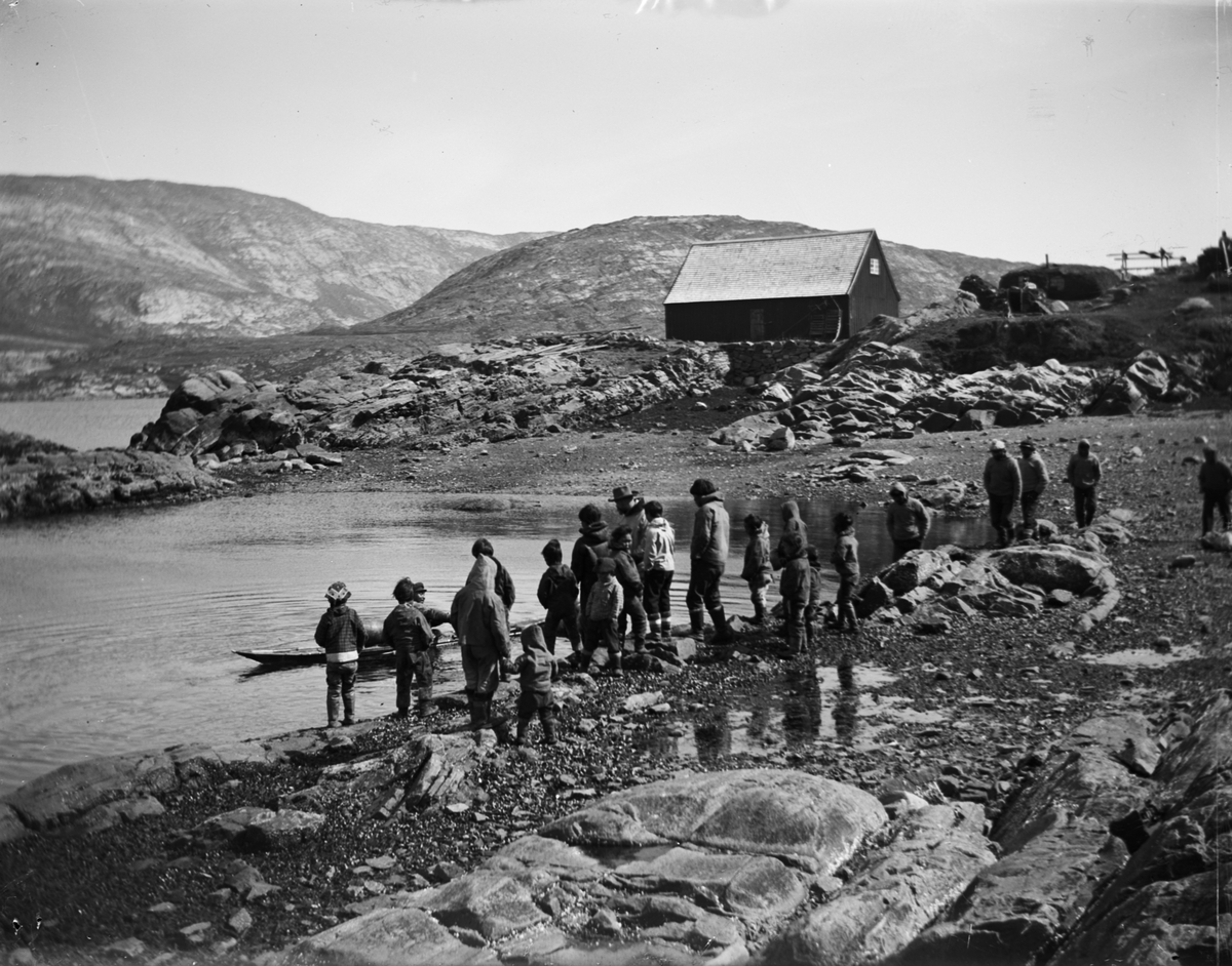 Fotografi från Grönland. Motiv av en grupp människor på stenig strand.